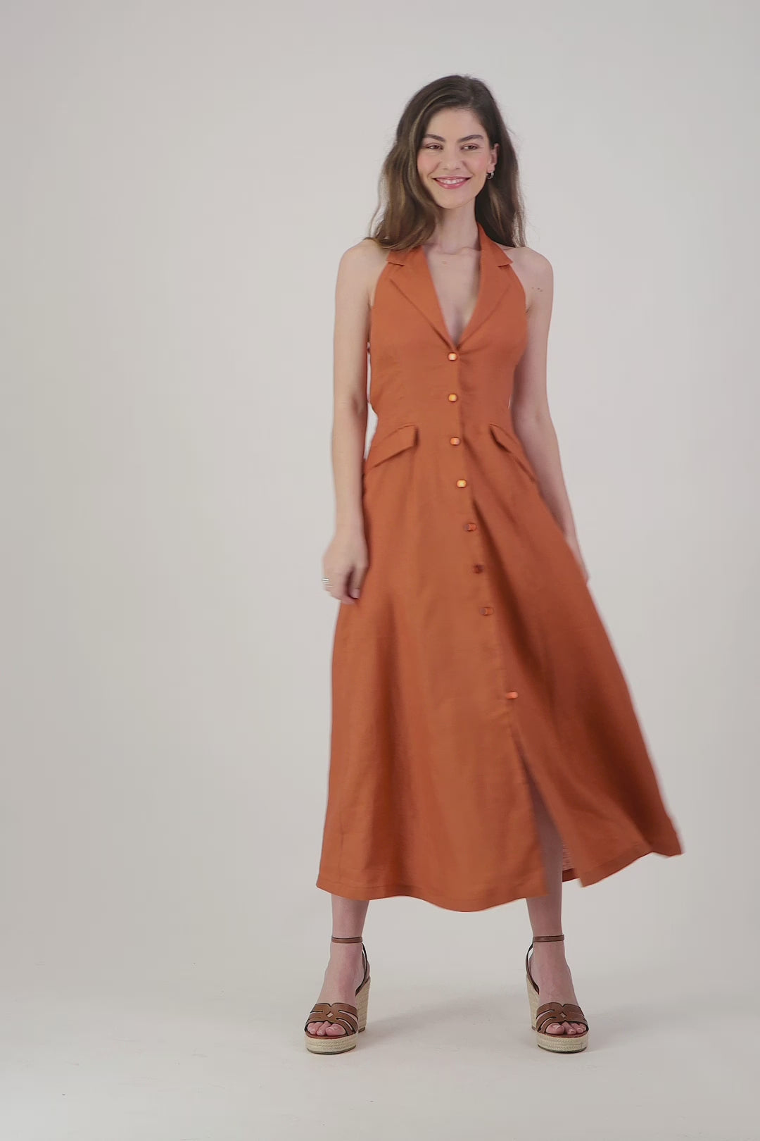 The Évienne Linen Dress is a stunning and sophisticated piece crafted from 100% pure linen. This elegant dress features a halter-neck design with a pointed collar, giving it a classic and refined silhouette. The front is adorned with a full-length button placket, and two functional flap pockets add a touch of practical style. The dress flows into a flattering A-line skirt, creating a graceful and comfortable fit. Perfect for any occasion, the Évienne Linen Dress effortlessly combines timeless style with breathable comfort.