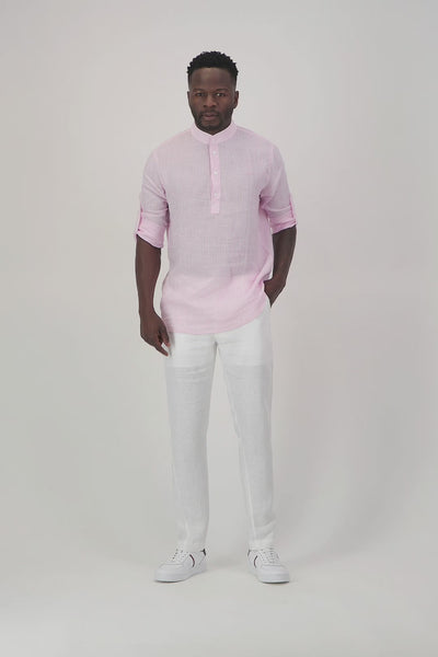 Constructed from 100% pure linen, the Rhodes Striped Linen Shirt in pink offers outstanding breathability and comfort. Its lightweight fabric ensures you stay cool while providing lasting durability, suitable for both casual and formal wear. This shirt features a tailored 3/4 sleeve and a distinctive striped pattern, blending timeless sophistication with expert craftsmanship for a lasting impression. Pair it effortlessly with our Capri Linen Pants or Brussels Cargo Pants to complete your look.