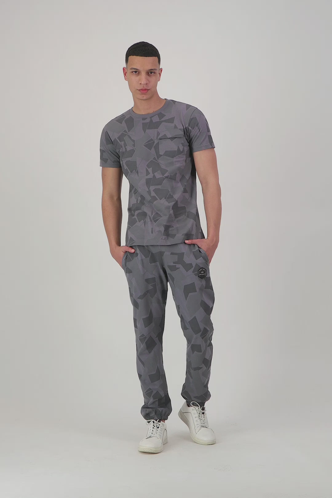 Elevate your athletic style with the Prague Camo T-Shirt - a fusion of urban edge and performance-driven design. This modern activewear piece showcases a bold geometric camo print in sleek shades of gray, instantly capturing attention with its eye-catching yet understated aesthetic.