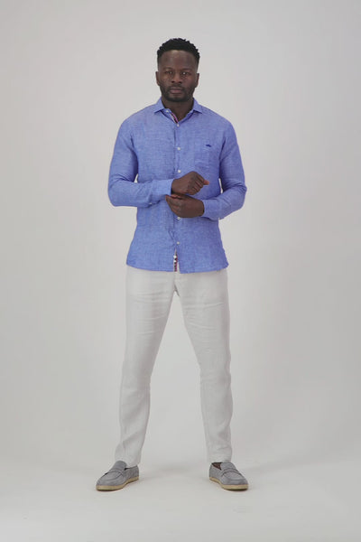 The Corinth Linen Shirt - Denim Blue is a classic and versatile long-sleeved shirt crafted from 100% linen. The vibrant denim blue color and subtle, natural texture of the fabric give it a stylish yet relaxed feel. It features a standard collar and a full button placket, with a small embroidered blue whale logo on the left chest, a signature brand detail. The inside of the collar and the cuffs feature a contrasting patterned fabric, adding a subtle touch of personality. It can be worn for both casual and semi-formal occasions, making it a timeless addition to any wardrobe.